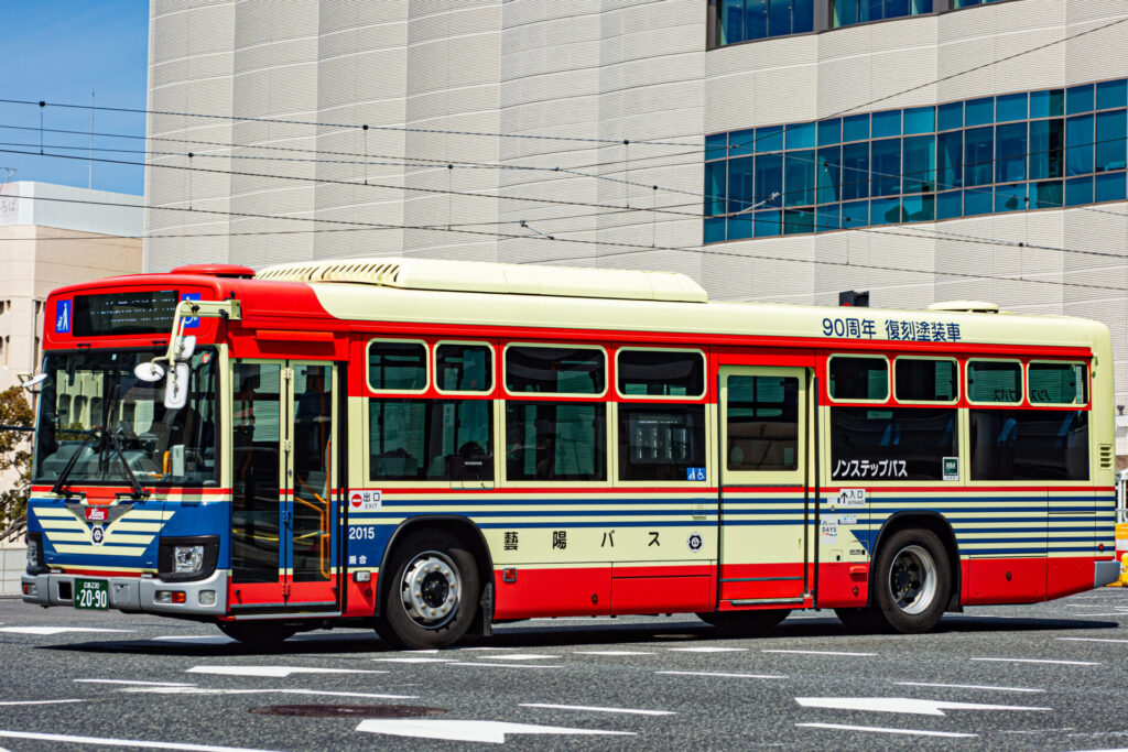 芸陽バス90周年記念の復刻塗装となっている車両で、前面には日野のウイングマークが備わっている他、芸陽バスの表記も旧字体となり一般車両とは異なっています。