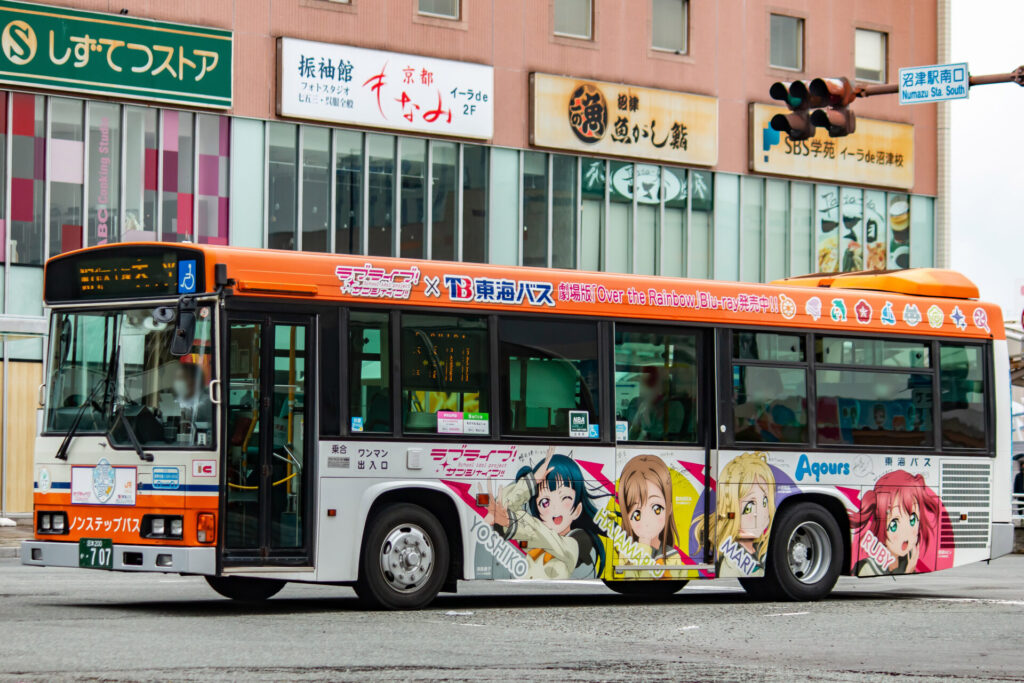 導入当初は沼津箱根登山自動車カラーの青色ベースにオレンジ色を足した沼津登山東海バスの初期の新車に施されたカラーを纏っていましたが、2016年か沼津市を舞台にしたアニメ「ラブライブ」のラッピングバスとなりました。(この車両はラッピング第1弾)