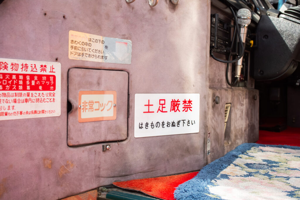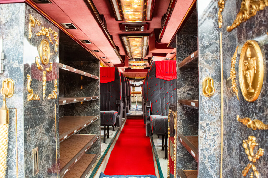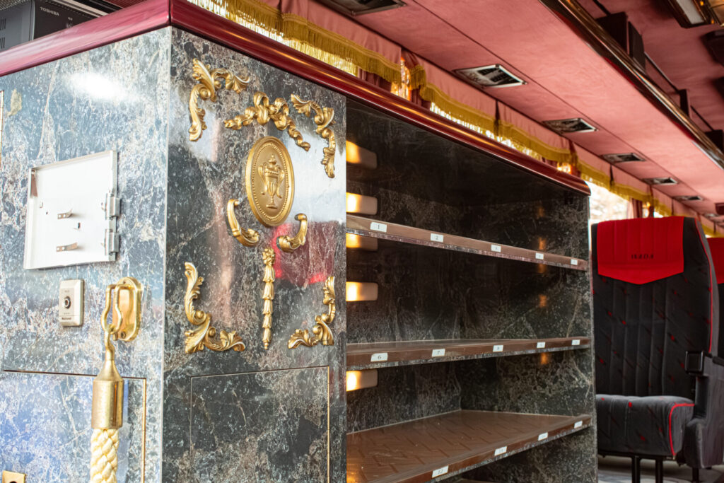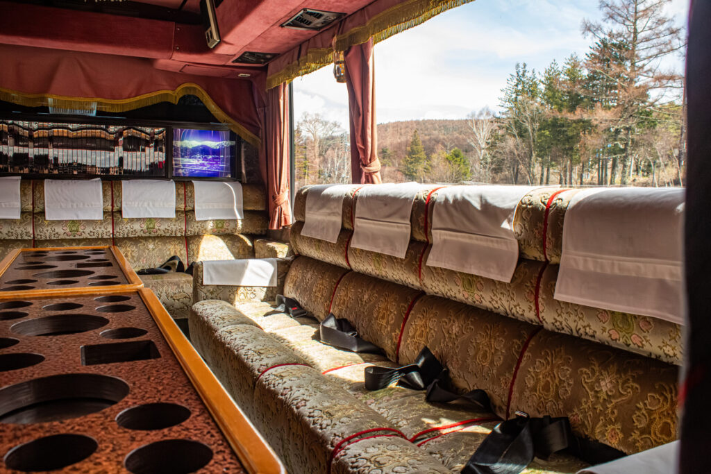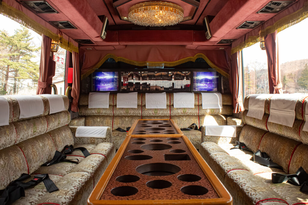 ステップを上がると、履物入れが両側に備わっており、豪華な車内空間へのこだわりを感じさせます。