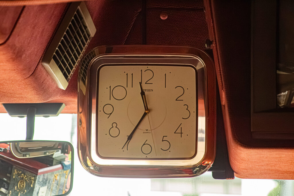 車両前部に取り付けられた時計は今のバスには決してないであろうアナログ式の時計となっています。